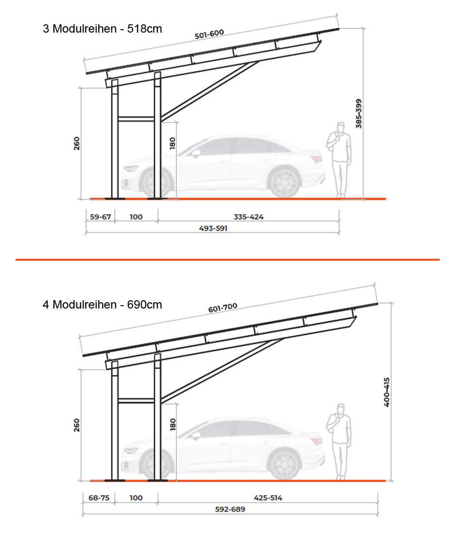 - Drei Modulreihen und vier Modulreihen möglich bzw. Tiefe 5,20 m oder 6,90 m.